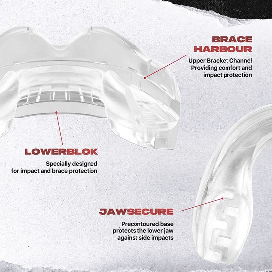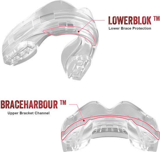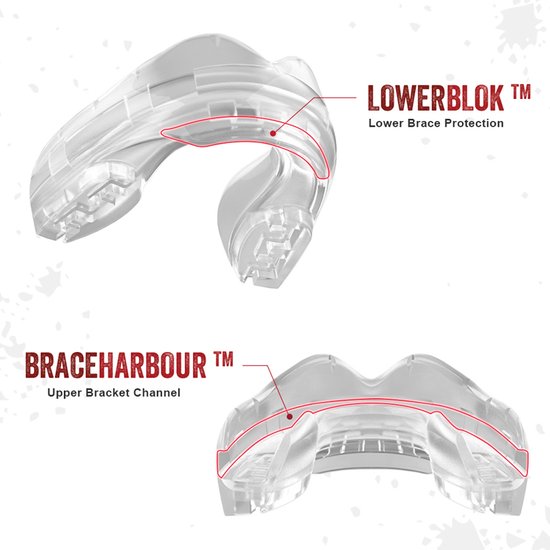 Deze gebitsbeschermer uit de Intro Series van Safejawz is gemaakt uit 2 lagen voor optimale demping. Er wordt gebruikt gemaakt van Fluid-Fit waardoor de beschermer volledig om je tanden te vormen is. Hierdoor blijft deze perfect op zijn plek zitten tijdens het sporten. De Jaw-Secure technologie van Safejawz zorgt ervoor dat je ondertanden, ondanks het feit dat het een enkele mondbeschermer betreft, toch beschermt zijn. Door de unieke vorm van de onderkant klik je je ondertanden als het ware vast in de gebitsbeschermer. Hierdoor zijn zowel je tanden als je kaak perfect beschermt. De gebitsbeschermer kan tot 3x opnieuw op maat gemaakt worden als je toch niet helemaal tevreden bent over de pasvorm. Als extra heeft deze beschermer een blok aan de onderkant waardoor je plaatjes van de beugel onder extra beschermt worden. Het 'Braceharbour' in de bovenkant sluit nauw aan om je plaatjes waardoor deze goed blijft zitten.